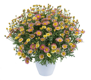 Argyranthemum-Angelic sweets Daisy is extremely hardy and will flower throughout spring and summer produces mounds of yellow then turn to pink blooms as they age best in full sun