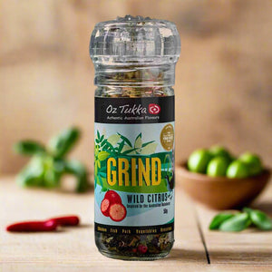 The Oz Tukka's Wild Citrus Grind contains a blend of Strawberry Gum, Lemon Myrtle, and Blood Lime that offers a unique and refreshing tang. This spice blend can elevate the flavor of fish, chicken, vegetables, dressings, and sandwiches. The ingredients include salt, blood lime, infused sugar, lemon myrtle, strawberry gum, ginger, rose pepper, and native thyme, providing a complex and zesty seasoning for all your dishes.