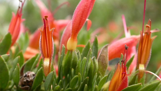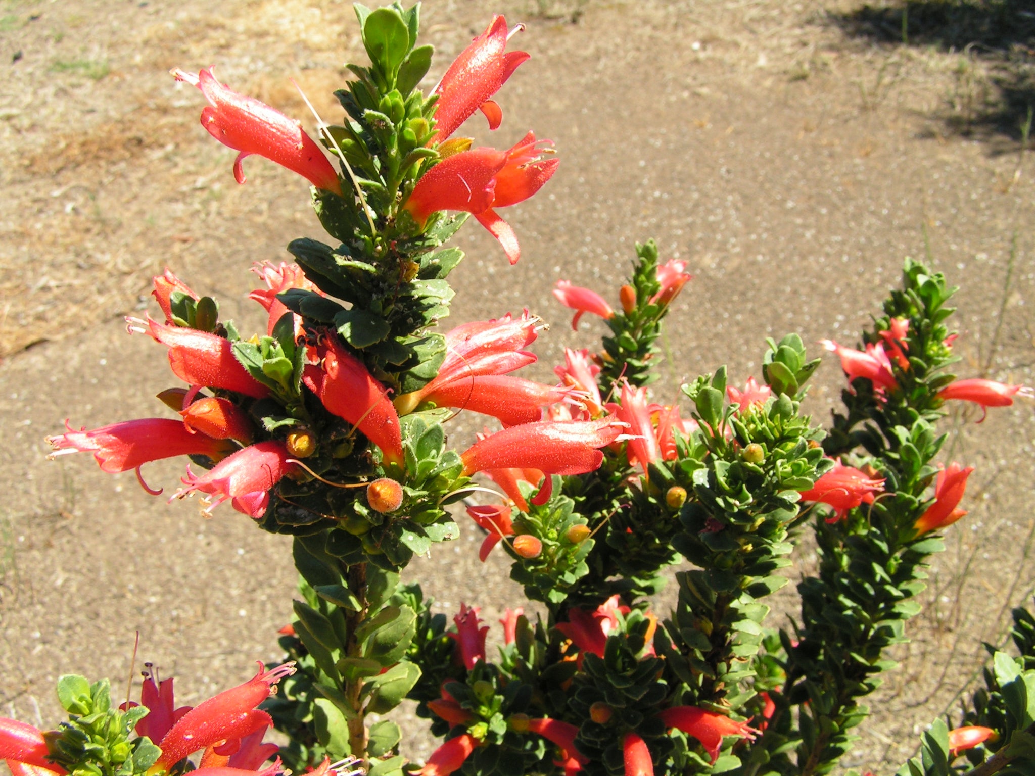 Its delicate, tubular flowers in shades of red, orange, and yellow bloom from autumn to summer, complemented by the soft grey-green foliage.