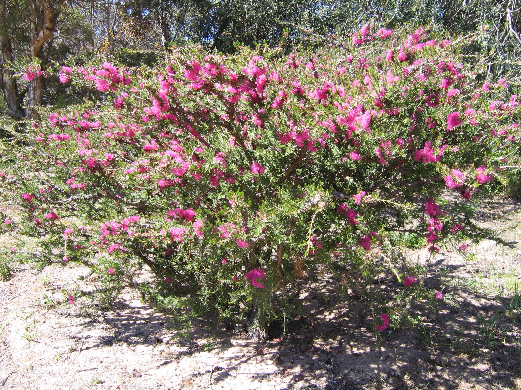 The plant develops into a substantial, densely-branched specimen reaching approximately 2 metres in height with a spread of up to 3 metres, distinguished by its characteristic rough, flaking bark.