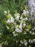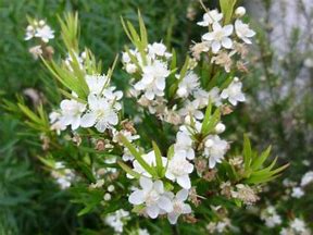 Austromyrtus tenuifolia or narrow-leaf myrtle with regular pruning makes a dense hardy hedge. It has narrow-leaves with five-petalled flowers which occur in the upper leaf axils in late spring through to summer. They are about 7mm in diameter and are followed by fleshy berries, round, light-purple and dotted with dark-purple spots the fruits are edible and can be used to make jams.