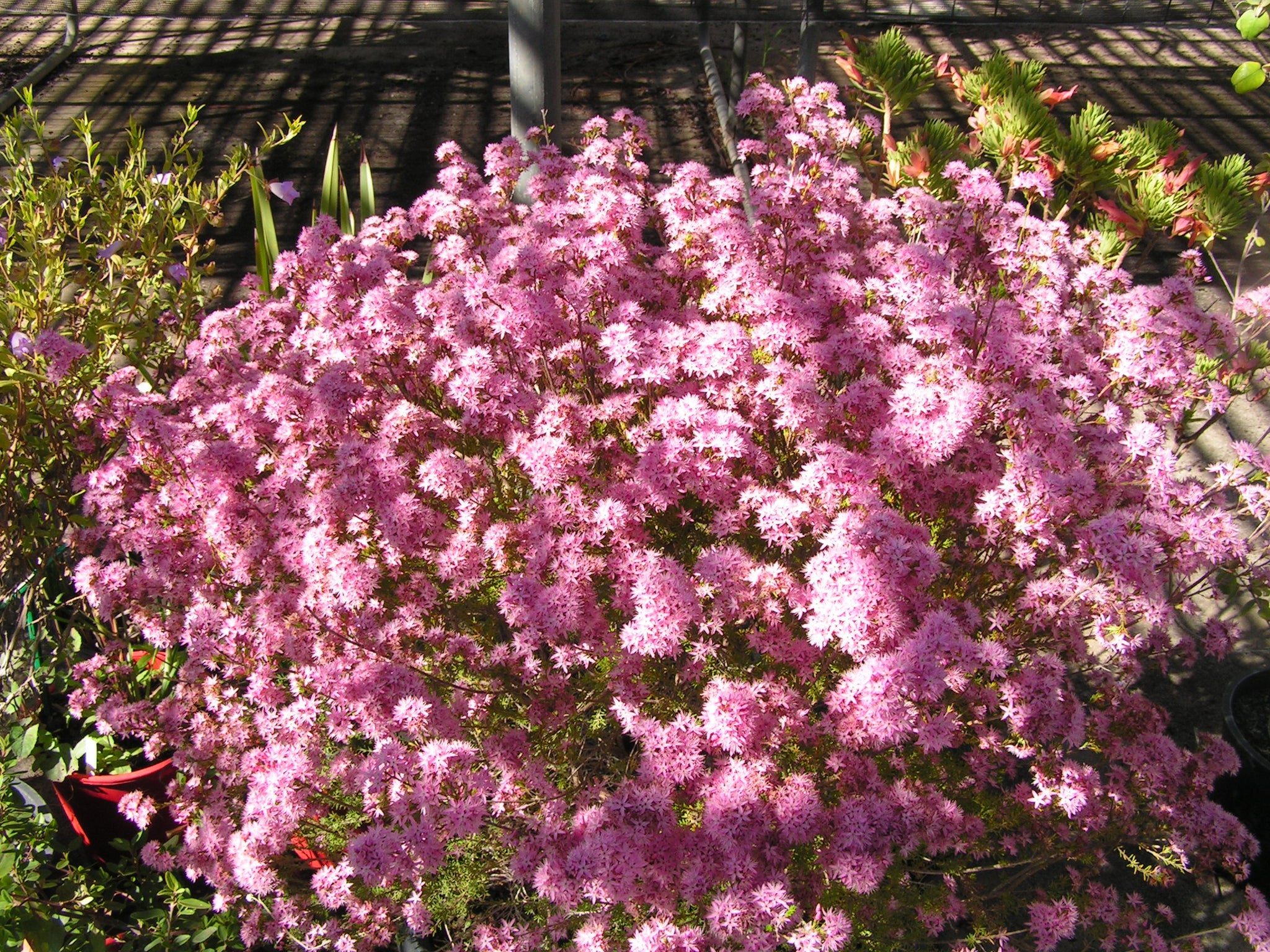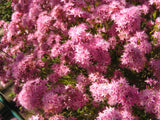 1m high x 50cm-1m wide. A beautiful shrub with starry pink flowers in profusion in mid Spring. Great for floral arrangements. Small thin leaves have a spicy fragrance when crushed. Suits sun to light shade and needs a well drained soil in a raised bed. Tip prune to encourage a more dense habit.