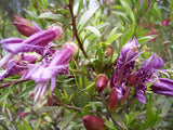 1.5m high x 1.5-2m wide.  Compact spreading shrub with dark green leaves and deep purple tubular flowers with spots inside.  Flowering time is from late Autumn to early Summer.  Prune to shape after flowering.  Will handle heavy soils and even deep sand.  Bird attracting.