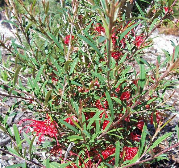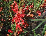 Grevillea poorinda firebird is a stunning plant that produces an abundance of clusters of vibrant scarlet flowers throughout Autumn and early Summer.