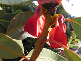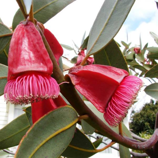 Shrub mallee to 2m high x 1.5m wide. An attractive ornamental mallee with a single low branching trunk and smooth grey bark and large thick glossy leaves. Feature of this mallee is the large shiny red flower buds on short twisted stems. Bud caps fall off to reveal short red flowers mostly in Winter. Prefers a poor sandy soil in an open sunny position, drought and frost resistant.