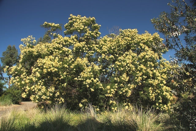 Medium-sized tree with dark green leaves. Cream ball-shaped flowers in Spring. Very hardy, fast growing in most situations.
