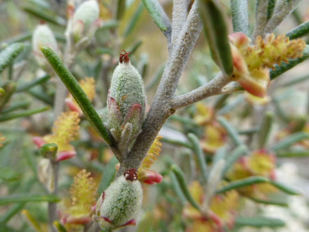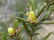 Its young foliage is covered in greyish or yellowish hairs, which eventually become smooth with age. The leaves are narrow-linear, reaching up to 30 mm in length and 2 mm in width.