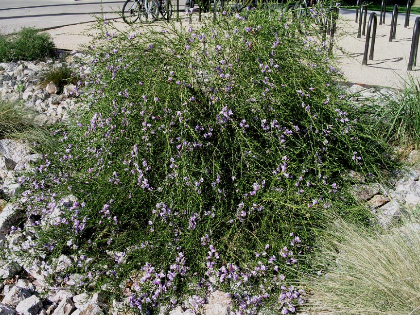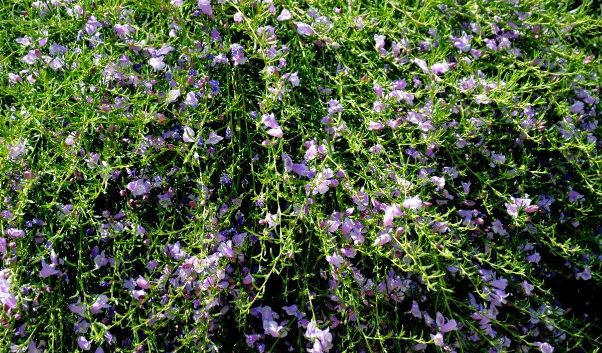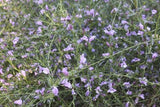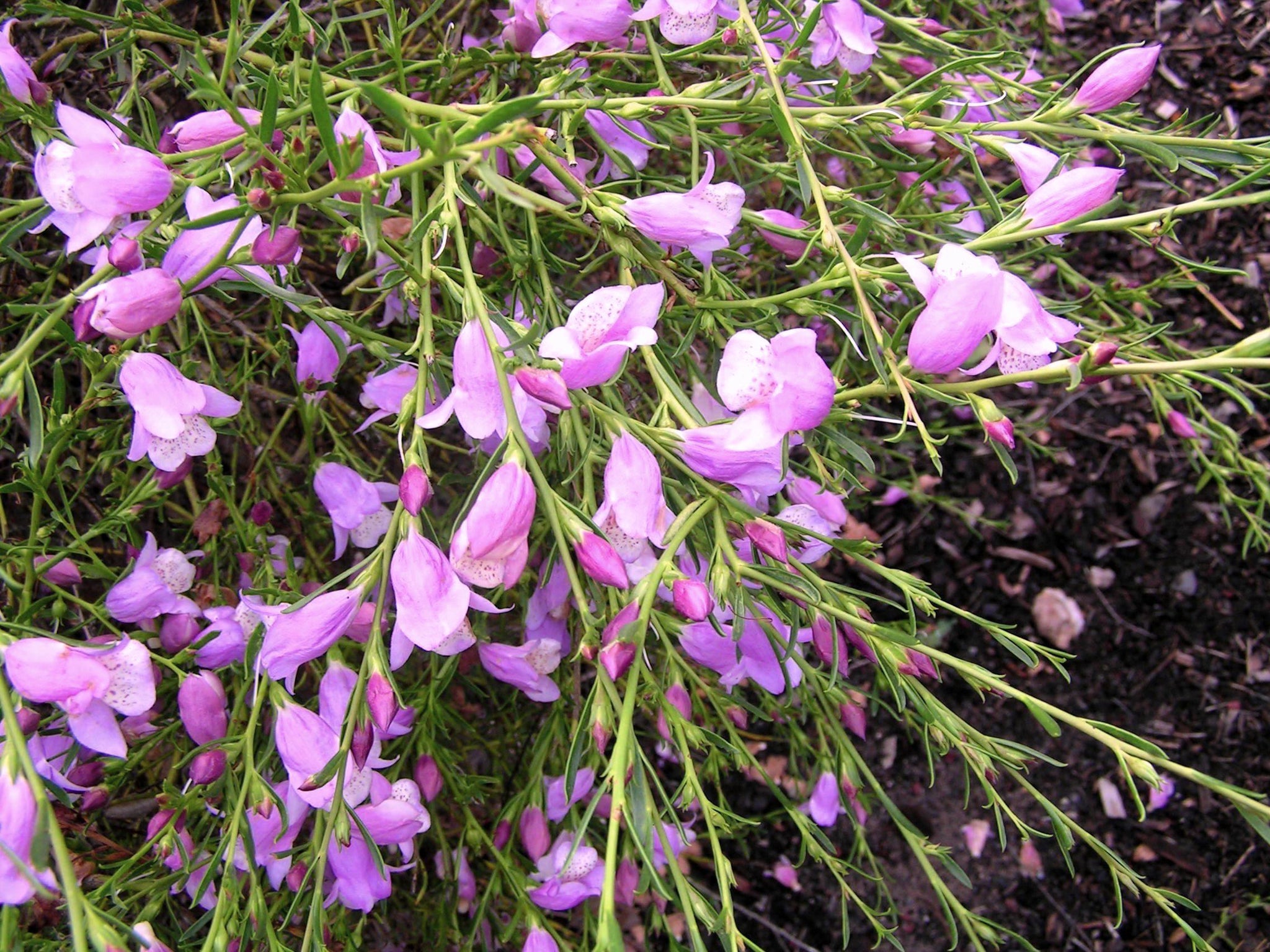 This native shrub has a tall and bushy appearance, featuring small slender green leaves and beautiful pale purple tubular flowers with freckles inside.