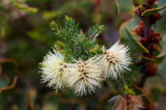 Its cream or white, bottlebrush-shaped flowers appear in spring in small spikes about 3-4 cm long.