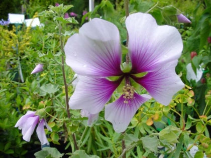 Lavatera maritima is a fast growing shrub with upright stems, rounded habit and soft grey-green lobed leaves.