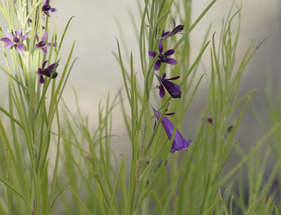 Rounded or dense, upright shrub or small tree to 4m high x 3m wide.  Silver-grey or grey-green narrow leaves.  Dark purple flowers appear from Autumn to Spring, but may also be sporadic.  Grows in most soils, including heavy clay and in full sun or filtered shade.  drought tolerant but with supplementary watering can be beneficial during a long, dry spell.  This can help develop flowers for the next season.