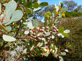 An attractive bird attractant, this tree has oval grey-green leaves, and belongs to the Family Myrtaceae. It is a small tree, reaching a height of 8 feet and a width of 6 feet. It is an evergreen, spreading tree that prefers dry, well-drained soils and is suitable for warm temperate, cool temperate, and Mediterranean climate zones.