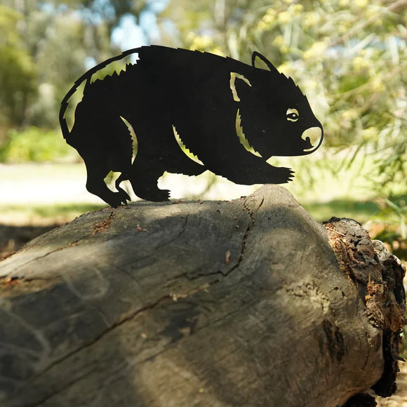 Installation: Comes with two pegs that are installed through the Wombats paws. Either installed vertically to be pushed into soft dirt or installed horizontally to create a free-standing art piece.