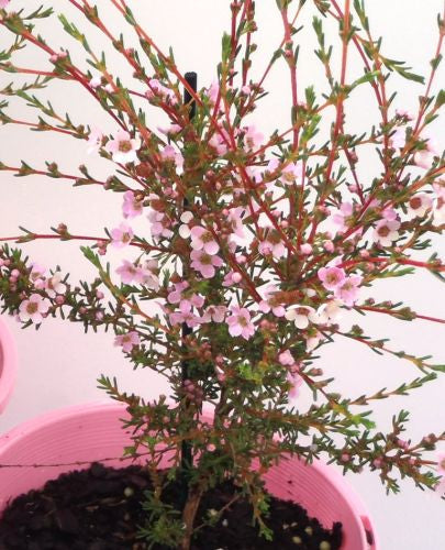 Small shrub with dainty pink tea tree like flowers in Summer Winter and Spring. Fine green foliage. Ideal for rockeries, garden beds and containers. Full sun - part shade.