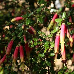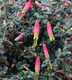 Low growing, wonderfully hardy shrub that flowers through the year. The flowers are long and tubular bell shaped, and are attractive to birds and other nectar lovers. Pink/red flowers. Will grow on a wide range of soil types, and in sun to shade. Best growth and flowering are in a well drained soil with a good compost mulch, and regular watering. Will survive if neglected, and rarely troubled by pests or disease.