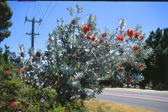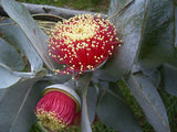 2-4m high. Spreading, straggly mallee or small crooked tree with broad silvery grey-blue leaves and powdery white branches. Very ornamental plant. Large red 10cm across flowers, with yellow anthers occur in Spring and Summer. Best suited to light well drained soils but adapts to heavier soils. Requires some training to develop good shape. Protection from leaf eating caterpillars.
