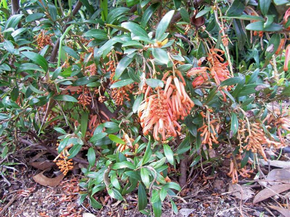 This shrub, known as Grevillea 'Apricot Charm', is a medium-sized plant that is exceptionally hardy and has glossy green leaves and apricot-colored flowers that elegantly hang off the branches.