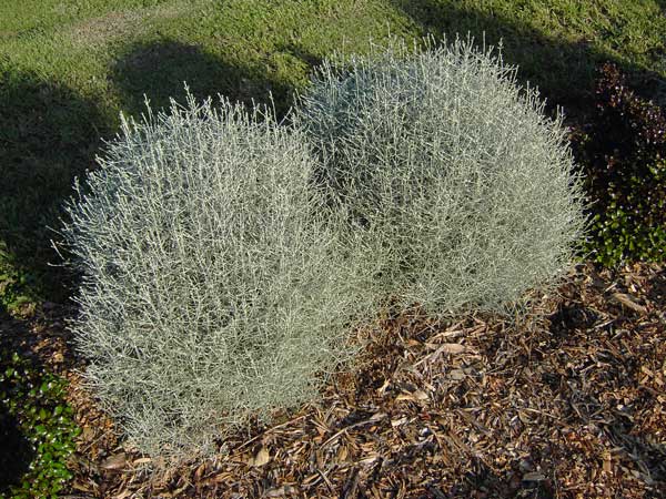Cushion Bush - 1-1.2m high and wide.  A great tough shrub for difficult areas, which brings interest to the garden with its textural growth habit. It has silvery grey stems with tiny leaves, and round umbels of silver to pale gold flowers in summer. Great for coastal sites, as it resist wind and salt spray beautifully. Good in most soils, and likes a sunny spot. A terrific low maintenance plant, drought resistant. Can be pruned to shape if desired, but it naturally grows in a neat bun shaped plant.