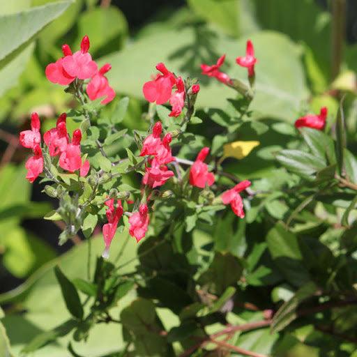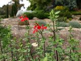 Evergreen plant, growing 70cm-1m high x 60-75cm wide.  Shrubby growth habit with many thin, but firm and upright stems.  Striking dark coloured stems - nearly black in colour and show off the red flowers.